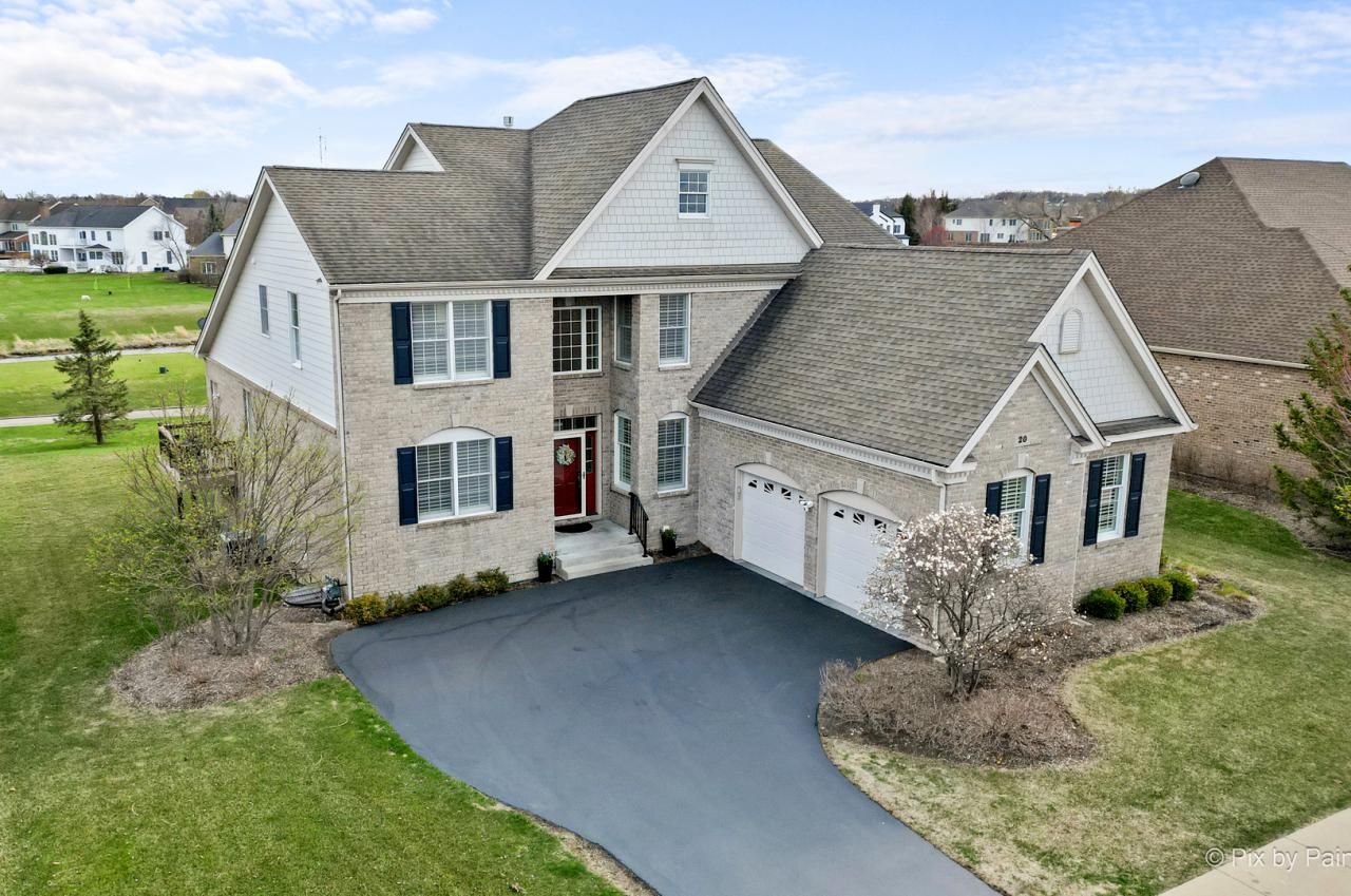 Luxury Living with Unmatched Golf Course Views and Sunsets in Hawthorn Woods Country Club! Welcome to the pinnacle of refined country club living in this exquisite 5-bedroom, 3.5-bath 3298 Sq Ft (above grade) Golf Villa, perfectly nestled on a PREMIUM WATERFRONT LOT along the 15th hole of the prestigious Arnold Palmer Signature Golf Course. Designed with a seamless blend of elegance, comfort, and breathtaking views, this rarely available Muirfield model Golf Villa in this gated community offers a lifestyle like no other. From the moment you step inside, you'll be struck by the grandeur of the soaring two-story foyer, setting the tone for the luxurious spaces that unfold. The living room features stunning floor-to-ceiling windows, inviting an abundance of natural light, while the family room is highlighted by its impressive bank of Palladian windows. The vast number of windows offer breathtaking views from both the 1st and 2nd levels. Recently upgraded gleaming dark oak hardwood floors flow gracefully throughout the first floor enhancing the home's sophisticated ambiance. A dual-sided gas Heatilator fireplace, flanked by rich grey brick surrounds, separates the living and family rooms, creating an inviting space to relax or entertain in style. Your private dining room exudes elegance with bold crown moulding and chair rail, offering the perfect setting for intimate dinners or festive gatherings. The gourmet kitchen is every chef's dream, featuring 42 maple cabinetry, granite countertops with beautiful ribbon tiled backsplashes. The countertop also features a built-in gas stovetop, while top-of-the-line stainless steel appliances from Samsung, GE, and KitchenAid round out the well-equipped space. Under cabinet lights and recessed lighting illuminates the space, while the spacious breakfast area opens directly onto an expansive, maintenance-free Azek wraparound deck-ideal for morning coffee, evening cocktails, or entertaining guests while soaking in picturesque golf course views, tranquil ponds, and stunning sunsets. The rare first-floor primary suite is a true retreat, offering soaring cathedral ceilings, his-and-her walk-in closets with custom Closets by Design organizers, and a spa-like en-suite bath. Dual vanities, a jetted jacuzzi tub, and a walk-in shower ensure a relaxing oasis to unwind after a long day. Upstairs, three generously sized bedrooms await, each with ample closet space and access to another beautifully appointed full bath. The lower-level deep pour English basement is an entertainer's dream, featuring approx 2,000 sq. ft. of finished living space, including a spa-like full bath with heated floors, a custom walk-in shower, and a fifth bedroom. This space is perfect for game tables, a cozy home theater, or any other use you can imagine. This home is packed with premium upgrades, including plantation shutters throughout, an underground irrigation system for both front and back yards, and a direct gas line to the deck for seamless gr