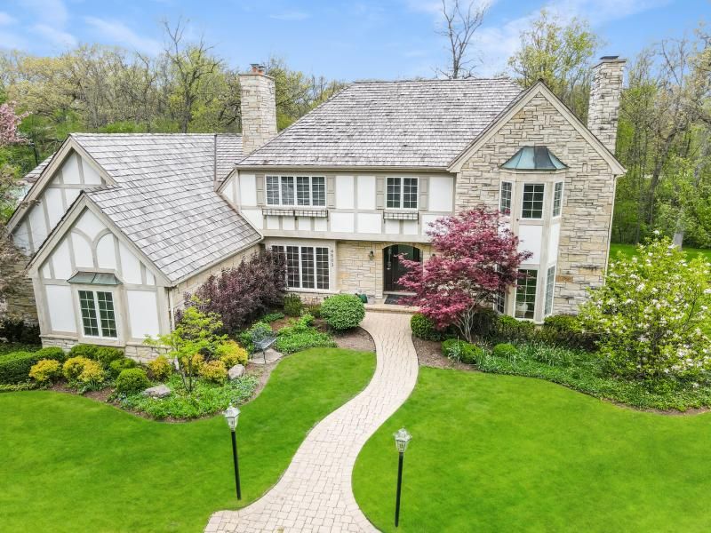 Almost 3 acres of privacy - a true retreat with resort amenities! A beautiful tree lined circle drive leads you to this classic stone tudor estate with pool and lighted tennis court/basketball court! With almost 4,500sf of living space there is plenty of room to spread out! Beautiful updated warm white kitchen with quartzite countertops, a stunning stainless steel farmhouse sink and high end appliances (Viking, Subzero, Thermador), island and table space. Main floor office with fireplace and wine cooler, family room with custom built-ins, entertainment size living and dining rooms. Very comfortable flow room to room with large spaces. Four bedrooms upstairs with a lavish primary suite which includes customized walk in closet and second washer/dryer. Two good sized bedrooms with nice closets share a hall bath with double sinks; and the huge 4th bedroom has a private bath. The finished basement has an expansive rec room with bar, sitting area, game area and there is a 5th bedroom and newer full bath in the finished basement. Plenty of storage. The views of the stunning property are beyond compare - entertainment options galore with huge paver patio with an outdoor fireplace, built in grill, and steps leading to pool and hot tub, and beyond to the lighted tennis/pickleball court and basketball court! Family and friends can be entertained for hours while safe at home! Great condition, including 4 year old cedar shake roof. Top nationally ranked Stevenson High School.